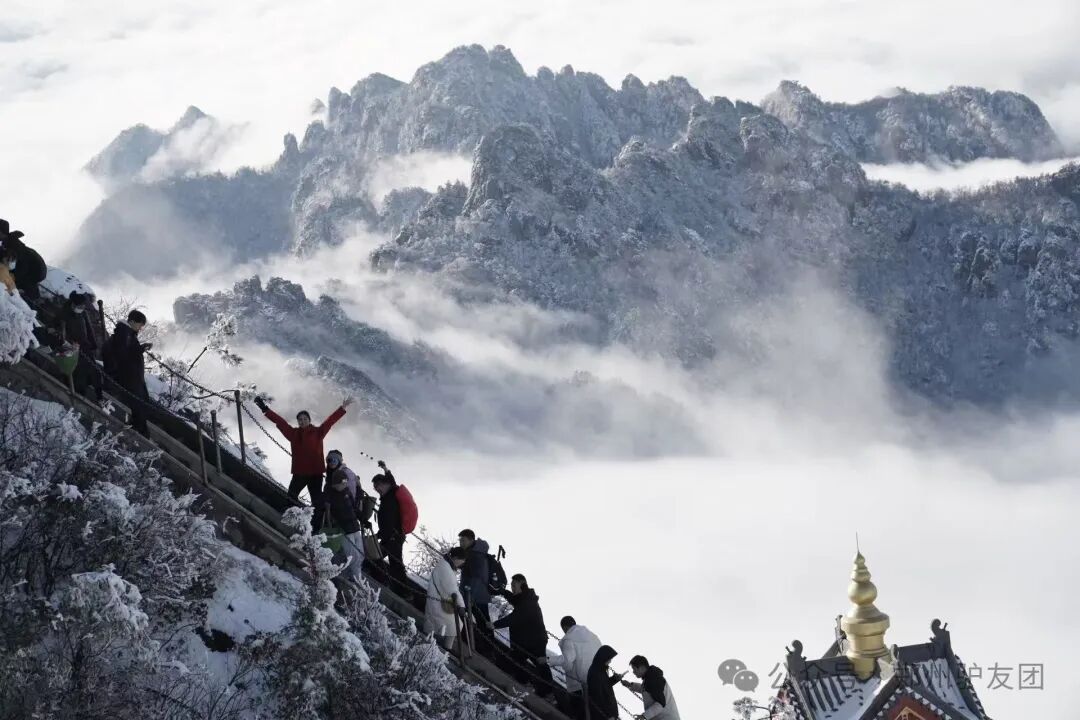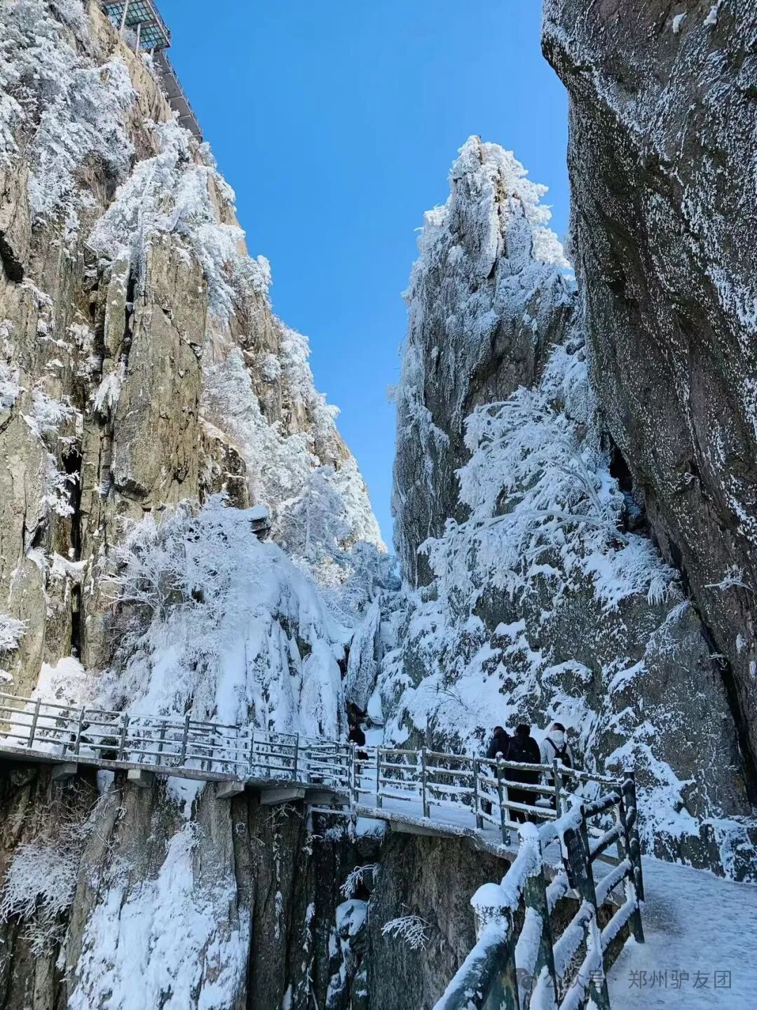 犹如仙人入画而来,蜿蜒栈道沿着岩体延伸,雪色松枝旁逸斜出