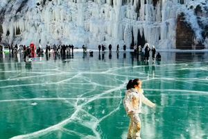 碧透的冰面如一块巨大的翡翠,与四周玉砌的群山、洁白的冰挂交相辉映